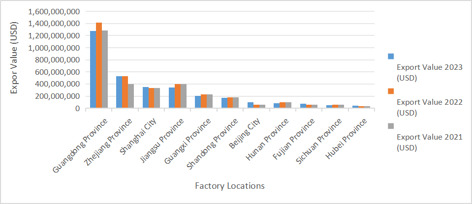 What are the main production locations of DC fans in China? The following bar chart shows the export values of DC fans for top 10 Chinese regions from 2021Y to 2023Y. Notably, Guangdong maintains highest export levels for passed a few years, contributing 37% of the total export value in 2023, which proves that most DC fan manufacturers are concentraded in Guangdong Province, expesically in Shenzhen, Dongguang and Zhaoqing and probally you can get the right DC fan supplier among these cities.
