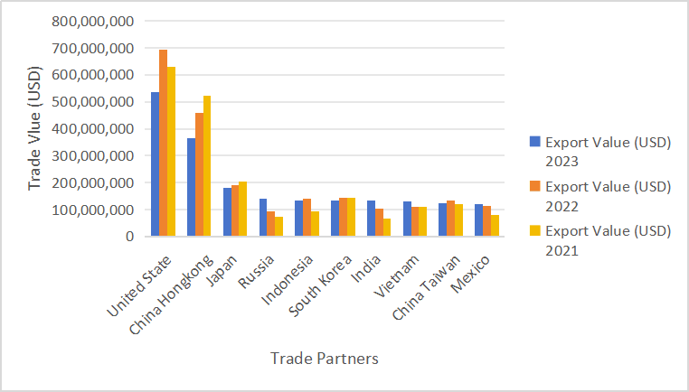 China has been the biggest exporter of DC fans in passed years. The following bar chart shows that China’s export value for 2021, 2022, and 2023 consistently exceeds other countries, which is followed by Germany and the USA.